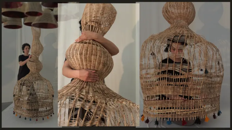 Description: This artwork features a tall, intricately woven basketry form that combines organic curves and textures, adorned with vibrant tassels symbolizing home, cultural richness, resilience, and the interplay between traditional craft and contemporary innovation.